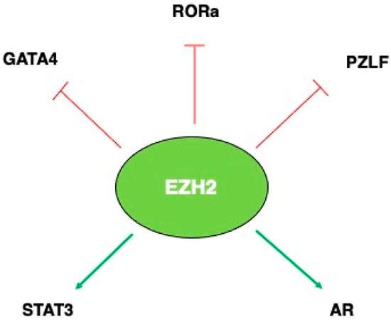 Intriguingly, EZH2 can behave as an activator or repressor of gene expression [29] and act independently of H3 methylation, by inducing the methylation of some non-histone proteins or by directly interacting with other proteins, both in a PCR2-dependent (PcD) and PRC2-independent (PcI) manner. EZH2 has been reported to methylate transcription factors (TFs) such as GATA4, RORα, PLZF, AR, and STAT3, with a strong impact on their activities (Figure 3). In this regard, He et al., demonstrated for the first time that PRC2/EZH2 directly methylates the transcription factor GATA4, a key regulator of heart development in mice and humans, resulting in an attenuation of its transcriptional activity. The authors showed that the methylation of GATA4 resulted in a significant inhibition of GATA4 acetylation by the acetyltransferases (HAT) p300. PRC2 represses GATA4 transcriptional activity by methylating the residue K299 and inhibiting the binding of it to p300, as demonstrated by using the GATA4[K299R] mutant (mutant that binds to both p300 and EZH2, but cannot be methylated) [30].