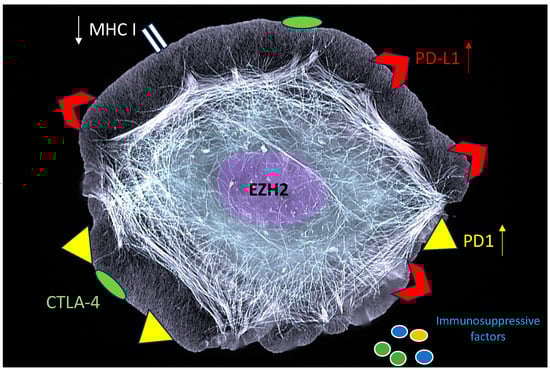 It is emerging that EZH2 strongly contributes to driving cancer cells’ immunoediting and immune escape [74]. It can interfere by several means with the anti-cancer immune response, e.g., by inducing the upregulation of immune checkpoints such as programmed cell death protein 1 (PD-1), PD-1 ligand 1 (PD-L1), and cytotoxic T-lymphocyte-associated antigen 4 (CTLA-4) [19,75]. Moreover, one of the most important mechanisms leading to cancer immune evasion, namely the suppression of the MHC-class I antigen processing pathway, can be induced by EZH2, favoring an immunosuppressive microenvironment [76]. Through noncanonical mechanisms, EZH2 contributes to the activation of pathways such as JAK/STAT3, which promotes the release of cytokines such as IL-10 and other immune suppressive factors (Figure 5). Moreover, EZH2 upregulation in the cells of tumor microenvironment sustains carcinogenesis, as it promotes the production of pro-angiogenic/immunosuppressive factors by tumor-associated fibroblasts (CAF), suppresses the expression of NKG2D ligands, thus reducing the NK cytotoxic response, promotes the T reg phenotype in T lymphocytes, and alters cellular metabolism increasing the production of lactic acid through the Warburg effect [77,78,79,80]. Last but not least, EZH2 has been reported to increase the recruitment of tumor-associated macrophages (TAMs) by cancer cells overexpressing it [81].
