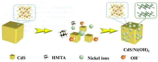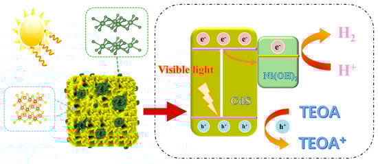 Notably, increasing amounts of studies are being conducted on CdS, which demonstrates excellent performance [17]. However, the problem of porous oxidation decomposition (photocorrosion) seriously restrains the capability of CdS [18,19]. In general, loading a proper cocatalyst on the photocatalyst can economically improve the photostability of photocatalysts by wisely consuming or transferring the resulting electron carriers [20,21,22,23]. Therefore, the reasonable introduction of a cocatalyst on CdS photocatalyst is an effective method to reduce CdS photocorrosion and achieve more efficient photocatalytic hydrogen production [24,25]. Studies have shown that cocatalysts can help catalyze multiple reactions at active sites, promote charge separation, prevent the photocorrosion of a CdS-based photocatalyst, and achieve high catalytic performance. Ni(OH)2 is a widely used cocatalyst because of its easy availability and abundant active sites [26,27].