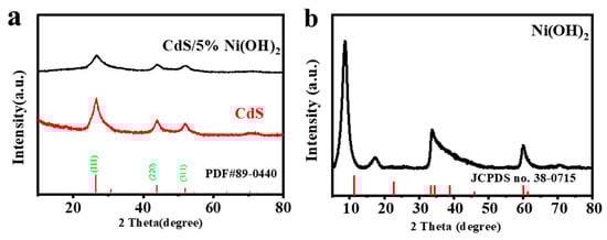 The X-ray diffraction (XRD) is utilized to determine the phase structure and crystallinity of the synthetic material. As depicted in Figure 3a, blank cadmium sulfide has a sphalerite phase structure. The diffraction peaks at 2θ = 26.4°, 43.8°, and 51.9° can be indexed to the (111), (220), and (311) crystal faces of CdS (PDF#89-0440), respectively. As exhibited in Figure 3b, the diffraction peaks of Ni(OH)2 at 8.7°, 17.3°, 33.4°, and 59.9° correspond to the (003), (006), (101), and (110) planes of α-Ni(OH)2 (JCPDS no. 38-0715) [29,30]. Notably, no obvious peaks of Ni(OH)2 are seen in the spectrum of the CdS/5%Ni(OH)2 composite, mainly because the peak intensity of Ni(OH)2 is weaker relative to CdS. In addition, the content of Ni(OH)2 in the system is rather low, meaning that the peak of Ni(OH)2 is obscured by CdS in the XRD pattern.
