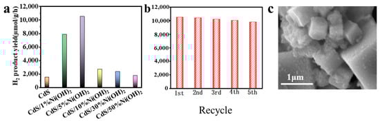 To assess the photocatalytic properties of blank CdS and CdS/Ni(OH)2 composites with varying amounts of Ni(OH)2, photocatalytic hydrogen production is employed. As presented in Figure 5a, the pure CdS shows an inferior photocatalytic performance owing to the high recombination rate of photogenerated electron–hole pairs, leading to the H2 evolution rate of only 1517.91 μmol/g/h. After introducing the Ni(OH)2 cocatalyst, all CdS/Ni(OH)2 composites demonstrate improved H2 evolution performance relative to the blank CdS. As the content of Ni(OH)2 increases, the hydrogen yield gradually rises. Significantly, the optimal H2 evolution rate (10,525.72 μmol/g/h) is shown by the CdS/5%Ni(OH)2 composite, which is approximately six times higher than that of CdS alone. Nevertheless, the H2 evolution activity decreases when the Ni(OH)2 content increases continuously. The photocatalytic performance of CdS/50%Ni(OH)2 is almost equivalent to that of the blank CdS. This may due to the remarkable shielding effect of Ni(OH)2, which reduces a certain amount of photocatalytic active sites and diminishes the CdS cube’s ability to absorb visible light [37]. Table 1 demonstrates that the photocatalytic hydrogen production rate of the CdS/Ni(OH)2 composite material exceeds that of similar photocatalysts previously reported in the literature. Since CdS is transition metal sulfide, it has been reported that CdS is likely to suffer severe photocorrosion [18,19,24,38], resulting in poor stability and a short usable life, which seriously impede the long-term development of the catalyst and the realization of industrial applications. As exhibited in Figure 5b, no remarkable deactivation has been observed in the CdS/5%Ni(OH)2 composite after five cycles, indicating the outstanding stability of the CdS/5%Ni(OH)2 composite. The SEM image of the CdS/5%Ni(OH)2 composite after the cyclic test (Figure 5c) shows that the morphology of the composite remains unchanged, further confirming the relatively great stability of the composite.