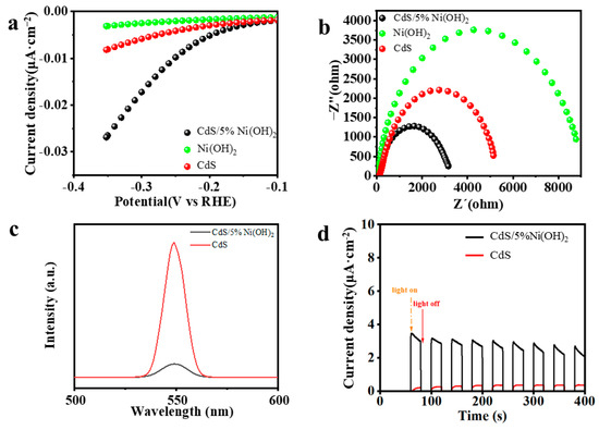 Photo/electrochemical tests are employed to further assess the efficiency of photogenerated carrier transfer, the electrical conductivity, and the active area of obtained samples, in order to investigate the factors resulting in the superior photocatalytic performance of CdS/5%Ni(OH)2 relative to pure CdS [48]. To evaluate the H2 evolution performance of CdS, Ni(OH)2 and CdS/5%Ni(OH)2 samples, linear sweep voltammetry (LSV) is initially employed. Figure 6a depicts the polarization curve of CdS, Ni(OH)2, and CdS/5%Ni(OH)2 composites. It can be obviously seen that the overpotential of CdS/5%Ni(OH)2 is less than single Ni(OH)2 and blank CdS at the same current density. This illustrates that the reduction capacity of the CdS/5%Ni(OH)2 binary composite sample is the strongest, and the hydrogen production effect is the best, which is in accordance with the data of catalyst hydrogen production activity, and in line with the expected regulation [49]. Electrochemical impedance spectroscopy (EIS), steady-state photoluminescence (PL) spectra, and the instantaneous photocurrent (IT) of pure CdS and CdS/5%Ni(OH)2 are utilized to investigate the charge separation and transfer of the obtained samples. As depicted in Figure 6b, the curvature radius of the impedance of single Ni(OH)2 is the largest among the three samples, indicating its poor electrical conductivity [50]. However, it is worth noting that after including Ni(OH)2, the curvature radius of the impedance diagram of CdS/5%Ni(OH)2 composite material is not immensely increased relative to that of blank CdS. On the contrary, there is a certain degree of decrease in the curvature radius of CdS/5%Ni(OH)2, which indicates that adding a trace amount of Ni(OH)2 improves the transfer rate of electrons, and does not simultaneously reduce the conductivity of the composite material [51]. As presented in Figure 6c, the steady-state photoluminescence (PL) spectra show that the PL intensity of the CdS/5%Ni(OH)2 composite sample is much lower than that of blank CdS. Generally, stronger fluorescence intensity indicates a more severe recombination of electron–hole pairs’ material. Therefore, the results indicate that the introduction of the cocatalyst Ni(OH)2 efficaciously suppresses the recombination of photogenerated carriers of CdS/5%Ni(OH)2 [52]. As depicted in Figure 6d, it can be apparently speculated from the low optical current density of CdS that the photogenerated carrier separation efficiency of CdS is poor. Nevertheless, the optical current density of the CdS/5%Ni(OH)2 composite is significantly improved after the addition of Ni(OH)2, relative to that of pure CdS, indicating that the CdS/5%Ni(OH)2 composite exhibits an enhanced separation efficiency of both the hole (h+) and the electron (e−) [53]. Above all, the outcomes of these photo/electrochemical tests confirm that the introduction of Ni(OH)2 cocatalyst can boost the transfer of the photogenerated charges carried in CdS/5%Ni(OH)2, resulting in the improved performance of the photocatalytic H2 evolution of CdS/5%Ni(OH)2. The cyclic voltammetry (CV) curve of the catalyst can be used to measure the reactive area.