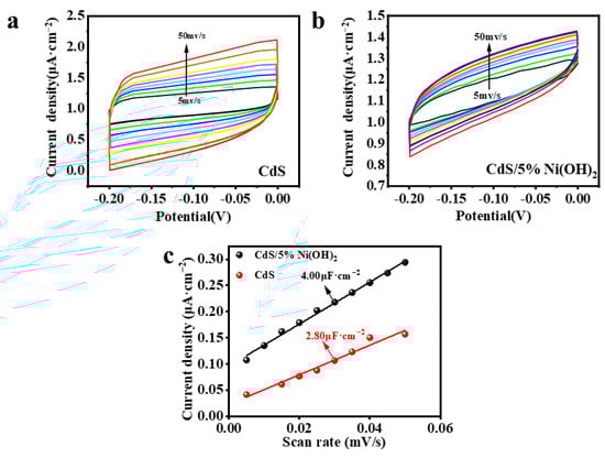 Obviously, the relative surface area of the CdS/5%Ni(OH)2 composite is superior to that of pure CdS (Table S1), indicating that the introduction of the Ni(OH)2 cocatalyst enhances the surface area of the composite. The increased specific surface area of the CdS/5%Ni(OH)2 composite suggests a higher number of exposed reactive sites, which in turn contributes to the improved photocatalytic performance of the sample. Also, the information regarding the chemical reaction area of the pure CdS can be seen in Figure 7a,b, indicated by the cyclic voltammetry test on the CdS/5%Ni(OH)2 composite. As presented in Figure 7c, the double-layer capacitance of the CdS/5%Ni(OH)2 composite (4.00 µF·cm−2) is substantially greater than CdS (2.80 µF·cm−2), which robustly validates that the CdS/5%Ni(OH)2 composite has a higher amount of active sites compared to CdS.