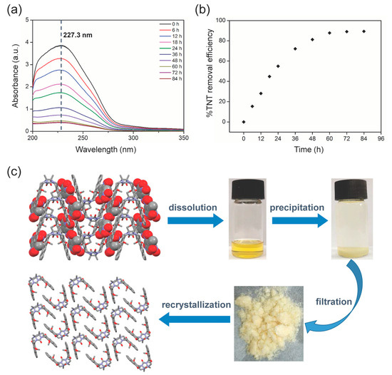 2,4,6-Trinitrotoluene (TNT) is one of the most widely used aromatic explosives in the field of national defense and the military industry, due to its explosive properties and low sensitivity to external stimuli [1,2]. As a Group C human carcinogen, TNT has toxic influences on the ecological environment and human health [3,4]. Therefore, it is important to realize TNT removal to mitigate concerns for human health, environmental protection and public security. In the last few decades, numerous methods have been proposed and developed for the removal of TNT, such as adsorption [5,6,7,8,9], oxidation [10,11], reduction [12,13] and photo-degradation [14]. Among these treatment methods, adsorption has been regarded as a promising approach by the virtue of its easy operation, high efficiency and ability to decrease secondary pollution [15,16]. However, most of the reported adsorbents, such as activated carbon [6,15], porous organic materials [5,17,18], porous silica [19,20] and grapheme [21], suffer from a low adsorption capacity. Therefore, it is still a challenge to develop new adsorbents for TNT with a high adsorption efficiency.