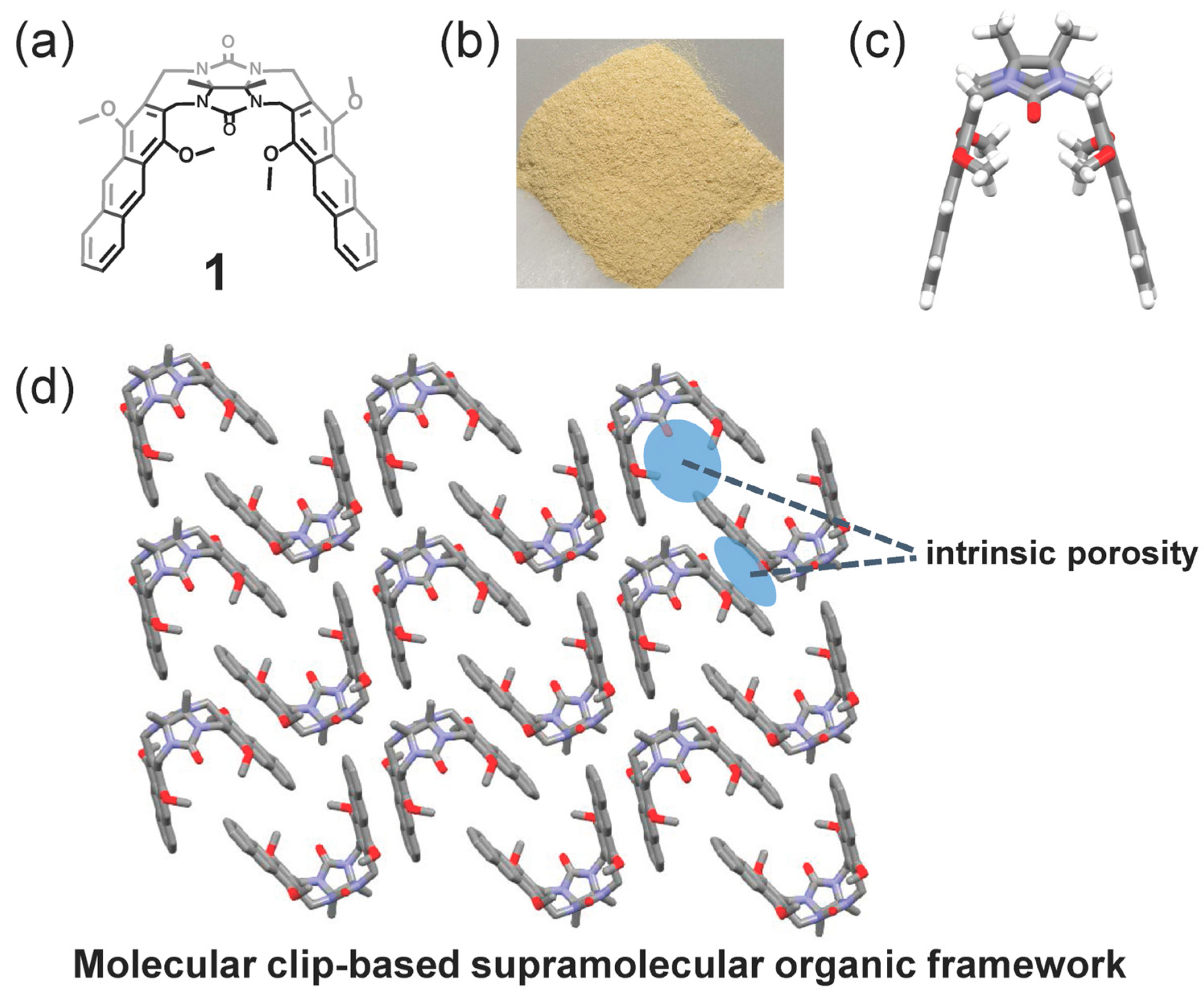 A glycoluril-derived molecular-clip-based supramolecular organic framework (clip-SOF) with intrinsic porosity was prepared. The clip-SOF was used for the adsorption and removal of 2,4,6-trinitrotoluene (TNT) driven by noncovalent interactions. The efficiency of TNT removal by clip-SOFs is up to 88.5% in adsorption equilibrium, and the TNT adsorption capacity of clip-SOFs is about 40.2 mg/g at 25.0 °C. Clip-SOFs have good reusability, exhibiting almost no loss in performance in ten consecutive recycling tests. This work not only provides a new method for adsorbing energetic materials, but also promotes the application of supramolecular hosts in crystal engineering.