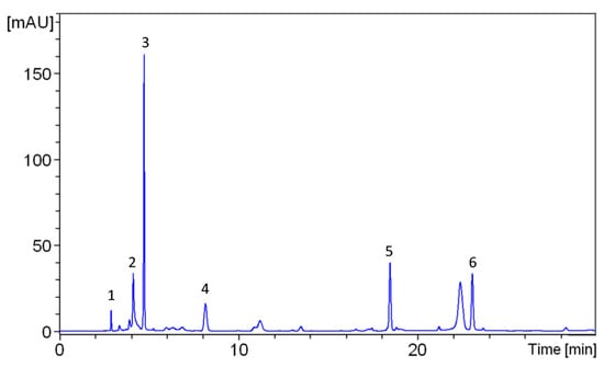 HPLC-UV chromatograms of onion extract acquired at 254 nm. Peak identification: 1—Gallic acid, 2—Myricetin, 3—Catechin, 4—Caffeic acid, 5—Quercetin, 6—Rutin.