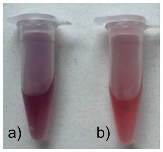 Synthesized colloids of Au NPs obtained with the reducer (a) onion extract; (b) sodium citrate.