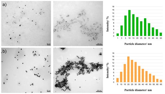 The basic technique for determining the shape, size, and surroundings of nanoparticles is transmission electron microscopy (TEM). Both obtained nanoparticles are spherical. In the case of nanoparticles obtained using onion extract (Figure 3a), the diameter of the nanoparticles is about 10–30 nm; in the case of those using sodium citrate (Figure 3b), it was 20 nm. In the second case, the size and shape are more uniform, due to the nature of the chemical-reducing agent. Natural reducing agents are most often multicomponent mixtures; therefore, it can be difficult to control various parameters of the nanostructures.