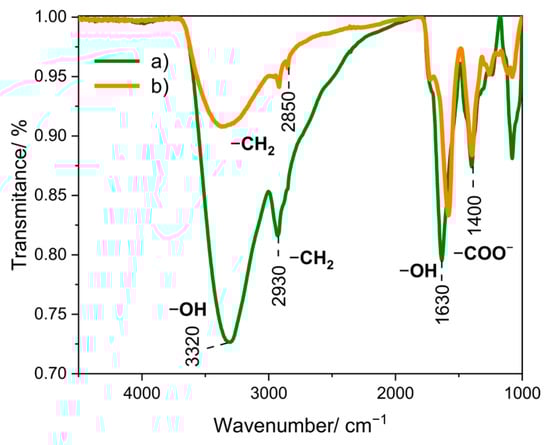 Fourier-transform infrared spectroscopy (FT-IR) is an analytical technique used to study the structures of molecules and identify the functional groups of a chemical compound. On the FT-IR spectrum for Au NPs synthesized using sodium citrate (Figure 4b), characteristic bands at 3360 cm−1 are noticeable, which corresponds to stretching and bending vibrations of the −OH groups, and bands 2920 and 2850 cm−1, which can be attributed to stretching vibrations in the −CH2 groups [39]. The 1590 and 1400 cm−1 bands are assigned to asymmetric and symmetric stretching vibrations, respectively, resulting from the presence of −COO− groups. This is related to the presence of carboxyl groups in sodium citrate [40]. In the case of Au NPs synthesized using onion extract (Figure 4a), a band located at 3320 cm−1 is visible, corresponding to the stretching and bending vibrations of the −OH groups. In addition, a band located at 2930 cm−1 is assigned to the (CH) modes of the −CH2 group [41]. The band observed at 1400 cm−1 may correspond to the −CH group found in alkenes [42]. This is due to the presence of many flavonoids in the onion extract, in the structure of which the pyran ring occurs [43].