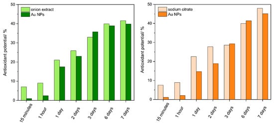 DPPH radical scavenging activity of reducer and Au NPs obtained using onion extract ((left) diagram) and sodium citrate ((right) diagram) after 15 min, 1 h, and 1, 2, 3, 6, 7 days. Results are expressed in terms of mean ± SEM (n = 3).