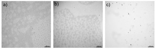The analysis of hydrogel morphology was performed using microscopic methods. TEM images (Figure 6) were taken to check the distribution of nanoparticles in the hydrogel masks. In the case of hydrogels with nanoparticles (Figure 6b,c), we observe uniformly distributed nanostructures in the gel network.