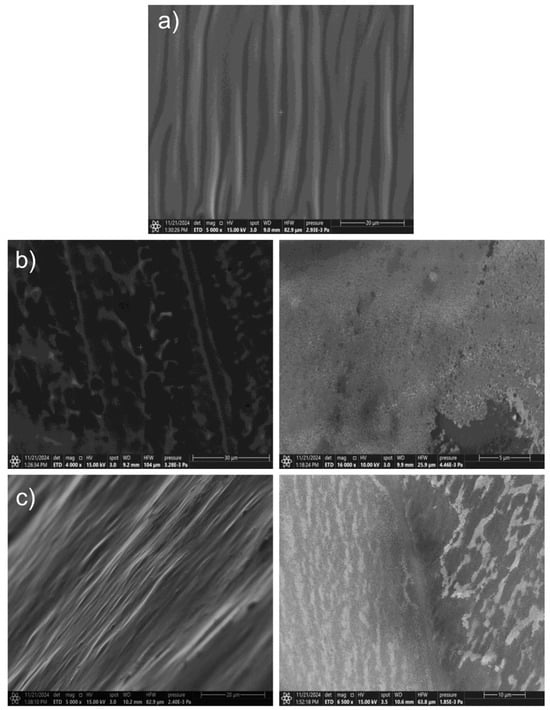 SEM images for hydrogel masks: (a) control and obtained using the reducer; (b) onion extract; (c) sodium citrate with smaller (left) and larger (right) zoom.