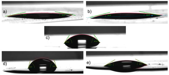 Water contact angle measurement results for: Au NPs obtained using the reducer (a) onion extract; (b) sodium citrate; (c) hydrogel mask (control, without NPs); (d) hydrogel mask Au NPs obtained using the onion extract; (e) hydrogel mask Au NPs obtained using the sodium citrate.