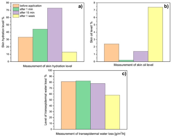 As can be seen in the graphs below, skin hydration (Figure 9a) increases over time after the application of the hydrogel to the skin. The rapid decrease visible after a week can be attributed to the evaporation of most water molecules from the hydrogel and the skin. On the other hand, measurements taken to examine the level of skin oiliness (Figure 9b) showed that after application alone, the oil level drops to practically 0. After a week, the recorded level is the highest. The above results allow us to conclude that hydrogels may have sebo-normalizing properties. In turn, studies of transepidermal water loss (Figure 9c) showed that after the hydrogel application, this level is slightly higher than before the application itself. With time, a decrease in the value is noted; after a week, a level of about 58 was reported. The above results showed that hydrogels have a moisturizing and normalizing effect.