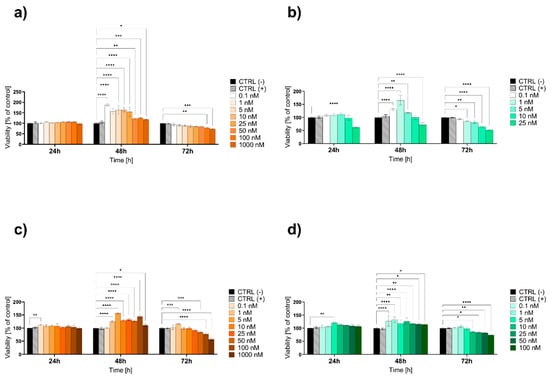 The viability of the HaCaT epidermal cell line evaluated by the MTT assay after 24, 48, and 72 h of exposure to lower concentrations of (a) hydrogel citrate Au NPs, (b) hydrogel onion Au NPs, (c) liquid citrate Au NPs, and (d) liquid onion Au NPs. Data are expressed as mean values ± SD from three independent experiments. * p < 0.05; ** p < 0.01; *** p < 0.001; **** p < 0.0001 versus negative control (CTRL−). The positive control (CTRL+) was water for the liquid formulations or hydrogel without Au NPs for the hydrogel formulations.