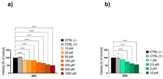 The viability of the HaCaT epidermal cell line evaluated by the MTT test after 24 h of exposure to high concentrations of (a) Au NPs citrate and (b) Au NPs onion. Data are expressed as mean values ± SD from three separate experiments. * p < 0.05; ** p < 0.01; **** p < 0.0001 versus negative control (CTRL−). The positive control (CTRL+) was water for the liquid formulations.