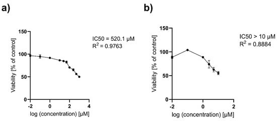 The IC50 values calculated by a nonlinear regression analysis for HaCaT (a) Au NPs citrate; (b) Au NPs onion after 24 h of exposure to high concentrations. Data are expressed as means ± SD for three separate experiments. R2—coefficient of determination.