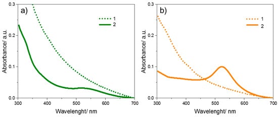 Absorption spectra for Au NPs obtained using the reducer: (a) onion extract; (b) sodium citrate. 1—for the receiving solution from the Franz diffusion chamber and 2—for the solution of nanoparticles used as an ingredient in the hydrogel mask (initial).