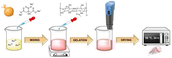 For the synthesis of Au NPs, 3 mL of a 5 mM tetrachloroauric acid solution was mixed with 50 mL of water. This solution was then stirred with a magnetic stirrer (IKA®, model RT 5, Staufen, Germany) at 120 °C. It was heated until it reached boiling point, and then 3 mL of reducing agent was added. As the latter mentioned, an onion extract or sodium citrate (0.02 M) was used. When the solution obtained a ruby color, it was heated for about 5 more minutes. Then, the purification process was carried out by centrifuging the colloid, removing the supernatant, and dispersing it in deionized water. The process was performed in three repetitions, and finally, the nanoparticles were suspended in water.