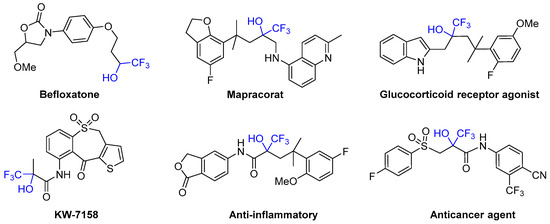Due to their unique pharmacokinetic properties, such as bioavailability, binding selectivity, metabolic stability, and cell membrane permeability, fluorine-containing groups have been widely used in drug design in recent years [1]. In particular, trifluoromethyl carbinols containing both trifluoromethyl and hydroxyl groups are a class of molecules that often exhibit significant biological activities [2,3]; some typical examples can be seen in Figure 1 [4,5,6]. Therefore, constructing molecules that contain trifluoromethyl carbinol is undoubtedly important and valuable for expanding the chemical space in drug discovery [7,8].