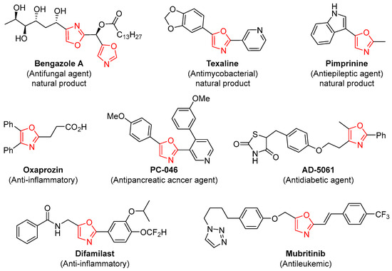 Examples of natural products and biologically active molecules containing an oxazole unit.