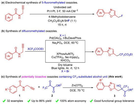 Among the different synthesis methods, those involving fluorinated oxazole derivatives are constantly being investigated [28,29,30]. For example, Doherty’s group [31] synthesized oxazolines through the 5-exo-dig cycloisomerization of N-propargylamides catalyzed using gold complexes, and then, via the carbonyl-ene reaction of oxazolines with ethyl trifluoropyruvate, they synthesized the corresponding hydroxytrifluoroalkylated oxazoles under the catalysis of [PdCl2{(S)-BINAP}]. However, a drawback of this method is that, in addition to requiring two steps, it uses Au and Pd catalysts, which are costly, thus necessitating the further development of novel methods involving the tandem reaction shown in Scheme 1.
