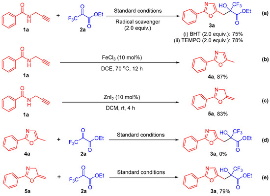 Second, small amounts of oxazolines and oxazoles were detected in the reaction. We therefore referred to the relevant literature [47,48] and synthesized oxazole 4a (Scheme 2b) and oxazoline 5a (Scheme 2c), using FeCl3 and ZnI2 as catalysts, respectively. When oxazole 4a was reacted with 2a under standard conditions, 3a was not produced (Scheme 2d), indicating that the reaction process might not involve the formation of 4a. Notably, 4a was simply a byproduct of the reaction, while oxazoline 5a could further react with 2a to afford the final product 3a in an isolated yield of 79% (Scheme 2e). This implies that oxazoline 5a is a key intermediate in this process.