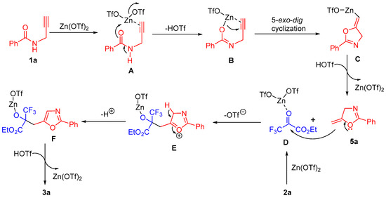 First, as a Lewis acid, Zn(OTf)2 can activate the triple bond of 1a to enhance the electrophilicity of alkyne A, and the intermediate B is formed through the loss of HOTf from A [49,50,51,52]. Then, the regioselective intramolecular 5-exo-dig cyclization of B affords the intermediate C [53,54]. Hydrolysis with HOTf (which is generated in situ, as mentioned above) occurs, resulting in the oxazoline intermediate 5a [49,51].