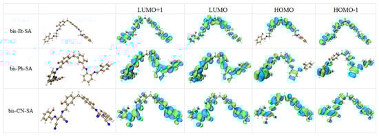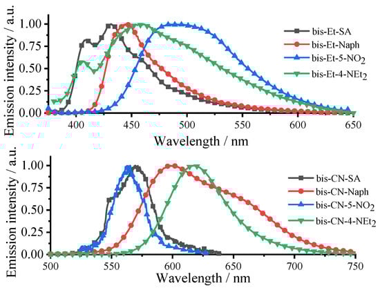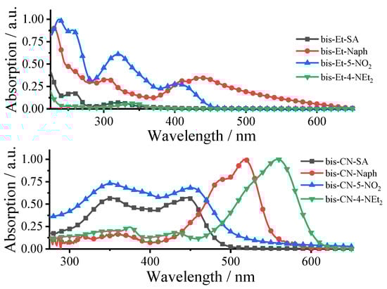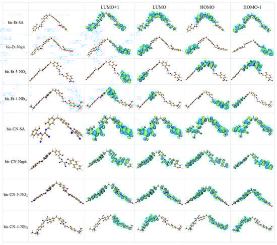 The optimized structures of bis-Et-SA, bis-Et-4-NEt2, bis-Et-5-NO2, bis-Et-Naph, bis-CN-SA, bis-CN-4-NEt2, bis-CN-5-NO2, and bis-CN-Naph are depicted in Figure 6. For compounds such as bis-Et-SA, bis-Et-4-NEt2, bis-Et-5-NO2, and bis-Et-Naph that possess a non-conjugated bridge composed of 1,2 ethylenediamine units, it is observed that they exhibit similar LUMO levels (Table 2 and Figure 6), UV–Vis absorption spectra, and emission spectra. The introduction of electron-donating substituents (bis-Et-4-NEt2, −0.2524 eV) or electron-withdrawing substituents (bis-Et-5-NO2, −1.3098 eV) along with the extension of π-systems (bis Et-Naph, −0.5815 eV) affects the HOMO orbital energy. These findings agree well with experimental observations made on UV–Vis absorption and emission spectra.