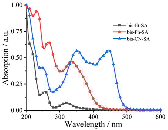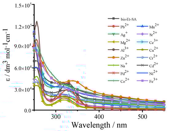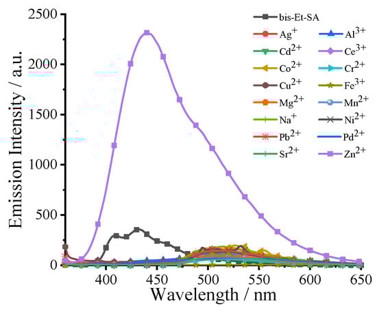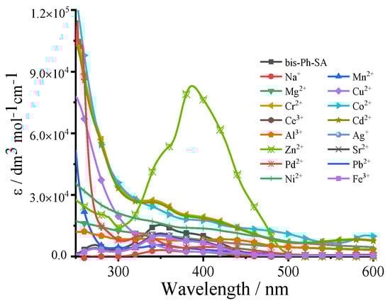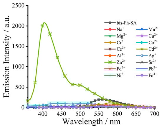 Bis-Et-SA and bis-Ph-SA were employed as chemosensors. Both compounds demonstrated comparable sensing capabilities towards a range of metal ions, including Ag+, Al3+, Ce3+, Cd2+, Co2+, Cr2+, Cu2+, Fe3+, Mg2+, Mn2+, Na+, Ni2+, Pb2+, Pd2+, Sr2+, and Zn2+ was studied in MeCN. The optical response of bis-Et-SA and bis-Ph-SA toward various metal ions was studied by UV–Vis absorption spectroscopy, as shown in Figure 8 and Figure 9. Obviously, adding Zn2+ resulted in the absorption peak of bis-Et-SA redshifts from 317 nm to 341 nm (Figure 8). The UV–Vis absorption spectroscopy of bis-Ph-SA is more obvious than that of bis-Et-SA when adding Zn2+. The intensity of the absorption peak at 400 nm in the UV–Vis absorption spectrum of bis-Ph-SA exhibited a significant enhancement upon the introduction of Zn2+ (Figure 9). A similar response phenomenon was observed in bis-Et-4-NEt2 (Figure S4) and bis-Et-Naph (Figure S5). Therefore, bis-Et-SA, bis-Et-4-NEt2, bis-Et-Naph, and bis-Ph-SA have the potential to be used as simple and rapid probes for detecting Zn2+.