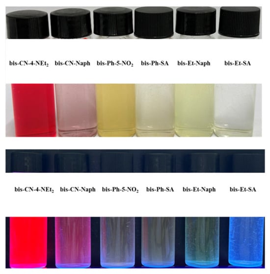 The fluorescence quantum yields of these bis-Schiff ligands in solution were determined using the optical dilute method developed by Demas and Crosby [57]. A standard sample of quinine sulfate (Φr = 0.55, quinine dissolved in 0.05 mol dm−3 sulfuric acid) was used for comparison, and the results can be found in Table 1. It is worth noting that the bis-CN-4-NEt2 compound with a D-A system exhibited remarkably high fluorescence quantum yield, reaching up to 0.84. Consequently, when observed under normal room lighting conditions (Figure 3), the solution of bis-CN-4-NEt2 emitted a vibrant red color.