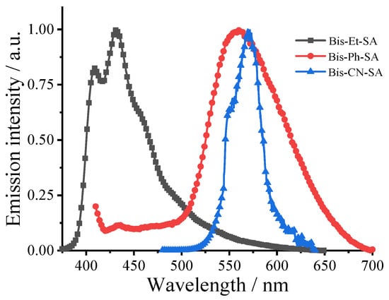 The normalized fluorescence emission spectra of bis-Et-SA, bis-Ph-SA, and bis-CN-SA in MeCN are presented in Figure 5. All three compounds contain the same diethylamino-phenol but differ in their bridges. Similar to the findings presented in Figure 2, a consistent trend was observed where the λem values decreased in the sequence of bis-Et-SA < bis-Ph-SA < bis-CN-SA. This can be attributed to the expansion of the π-conjugated system and the presence of donor-acceptor systems within these Schiff ligands.