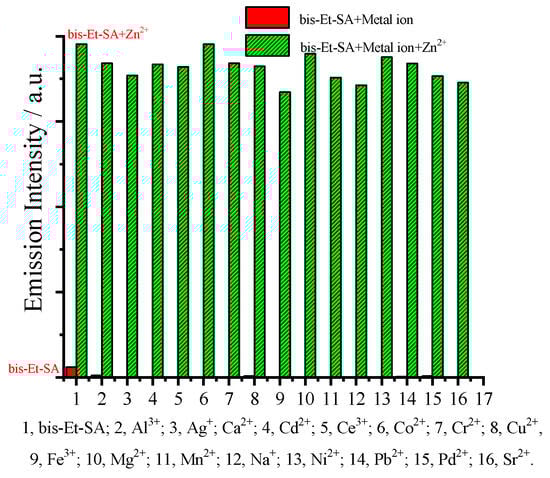 The selectivity is undoubtedly a crucial characteristic of a probe, referring to its preferential response towards the primary ion compared to other ions existing in the solution. The selectivity of fluorescence detection is better than that of colorimetric detection for bis-Et-SA and bis-Ph-SA, as demonstrated in Figure 10 and Figure 11. The addition of various metal ions to bis-Et-SA resulted in little changes in the emission intensity at 450 nm. However, upon the addition of Zn2+, there was a significant increase in the emission intensity at 450 nm by approximately 10-fold, indicating the excellent selectivity of bis-Et-SA for detecting Zn2+. Meanwhile, for bis-Ph-SA, adding many other metal ions led to no or a little enhancement of emission intensity at 575 nm; but, when Zn2+ was added, the emission peak blue shifted to 405 nm and increased sharply to over 2000 fold, indicating that bis-Ph-SA had a good selectivity to detect Zn2+. A similar fluorescence phenomenon was observed in bis-Et-4-NEt2 (Figure S6) and bis-Et-Naph (Figure S7).