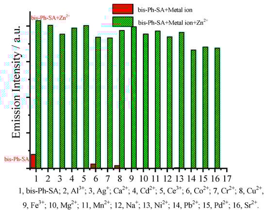 Selectivity of bis-Ph-SA (1.0 × 10−5 mol dm−3 in MeCN, emission measured at 405 nm and excited at 340 nm) toward 2.0 equiv. of other metal ions and Zn2+.