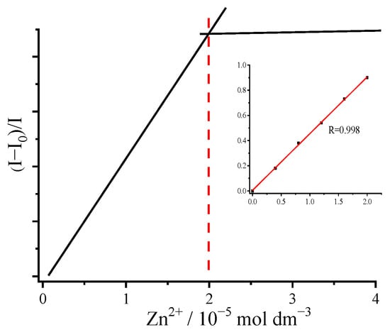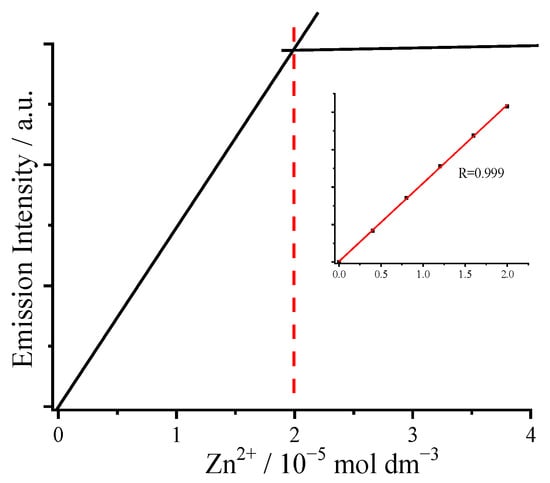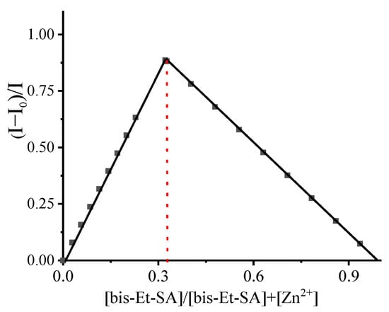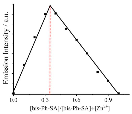 The selectivity of these binuclear Schiff base ligands is much better than that of containing only one chelating unit [O^N^N^O] Schiff base ligands. The changes in fluorescence and UV–Vis absorbance spectra induced by Zn2+ ions are likely attributed to the coordination between binuclear Schiff base ligands and Zn2+ ions. The chelation effect will prevent the ESIPT and nonradioactive processes, thereby inducing an enhanced fluorescence phenomenon and a shift in emission wavelength. Job’s plot analysis reveals a 1:2 stoichiometric binding between bis-Et-SA, bis-Ph-SA, and Zn2+ ions (The dotted line in red is shown in Figure 14, Figure 15, Figure 16 and Figure 17).