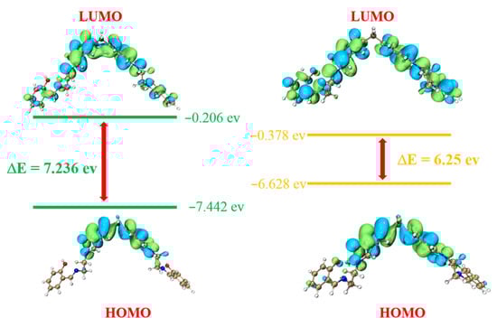 To gain deeper insights into the excited states, we conducted TD-DFT calculations using ORCA 5.0.4 [58] for all bis-Schiff ligands. Cam-B3LYP/6-311G(d,p) was employed as the computational method. The PCM model with acetonitrile as the solvent was incorporated in all calculations. FMOs were obtained using Multiwfn 3.8 (dev) [59] and VMD 1.9.3 [60] software tools. To ensure that the optimized stationary point represented the energy minimum on the potential energy surface (PES), harmonic vibrational frequency analysis was performed at the same calculation level, resulting in no presence of imaginary vibrational frequencies. Theoretical modeling was carried out considering acetonitrile solvent conditions. Table 2 and Figure 6 and Figure 7 present diagrams illustrating LUMO+1, LUMO, HOMO, and HOMO-1 for ground states along with frontier molecular orbital energies of bis-Schiff ligands.