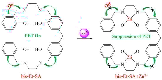 The FT-IR spectra of bis-Et-SA and bis-Et-SA+Zn2+ were examined. As depicted in Figure 19, a noticeable shift in the stretching vibration absorption of the C=N bond was observed, shifting from 1635 cm−1 (free bis-Et-SA) to 1575 cm−1 (bis-Et-SA+Zn2+). The coordination of Zn2+ was observed with the nitrogen in the C=N band, as evidenced by the 1H NMR and FT-IR data. The calculated theoretical results suggest a reasonable reduction in the energy gap between HOMO and LUMO for the bis-Et-SA+Zn2+ compared to that of bis-Et-SA (Figure 20), which agree with the observed changes in absorption spectra upon addition of Zn2+ ions. The proposed mechanism illustrating the formation of the complex between bis-Et-SA and Zn2+ ion can be seen in Figure 21. The lack of light emission from bis-Et-SA in acetonitrile solution is primarily attributed to the photoinduced electron transfer mechanism (PET), while the enhanced fluorescence upon the addition of zinc ions can be ascribed to the constraints imposed by the suppression of PET.