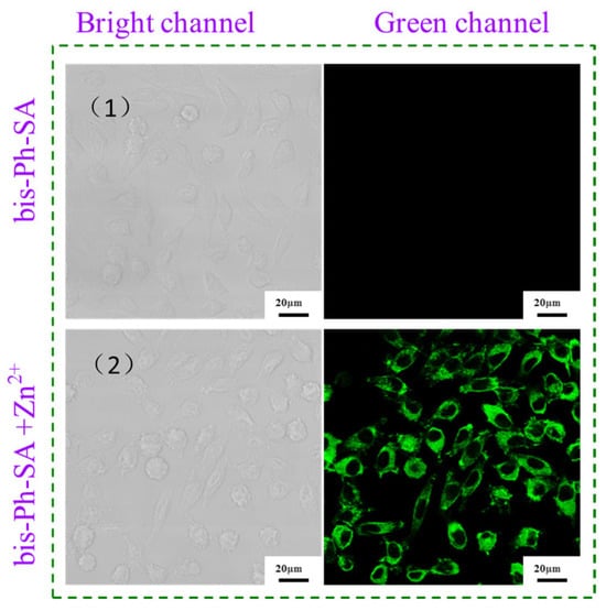 Fluorescent images were captured of Hela cells. (1) Bis-Ph-SA (30 μM) was added to the culture medium and incubated with Hela cells for 40 min. (2) Prior to treatment, Hela cells were exposed to bis-Ph-SA (30 μM) for 40 min, followed by an additional 40 min incubation with Zn2+ ions (60 μM).