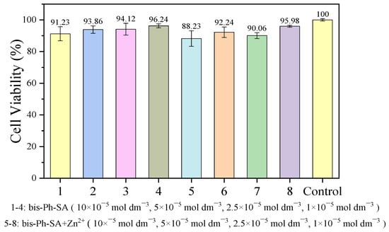 Cytotoxicity of L929 was performed by immersion in the 10% PBS DMEM and holding it for 24 h in 5% CO2 at 37 °C. L929 cells were seeded in 96-multiwell plates in 500 μL 10% PBS DMEM and kept running for 24 h at 37 °C. Then, the old culture medium was removed. Samples of 30 μM with different concentrations (1, 2.5, 5, 10 × 10−5 mol dm−3) of bis-Ph-SA were added into each well; meanwhile, samples of 30 μM with different concentrations (1, 2.5, 5, 10 × 10−5 mol dm−3) of bis-Ph-SA and 60 μM Zn2+ ions were added into each well, after the cells were seeded at a density of 2000 per well in the 96-well plate and kept running for 24 h at 37 °C in the presence of 5% CO2. Then, a CCK-8 assay was performed to evaluate cell viability [61,62,63].