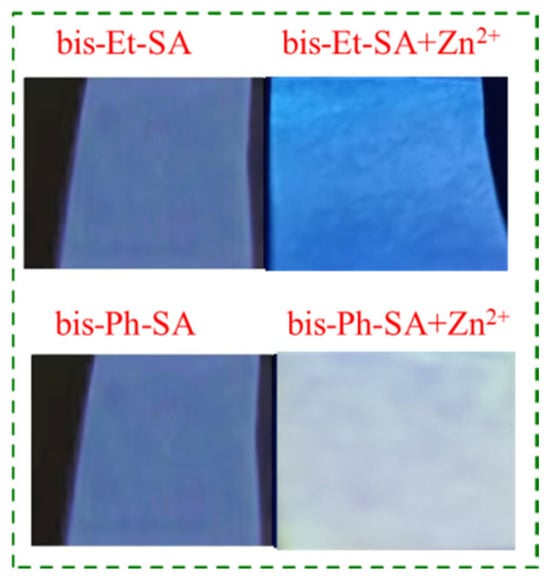 Pictures of bis-Et-SA and bis-Ph-SA test strips treated with Zn2+. The photographs were captured upon exposure to 360 nm UV light.