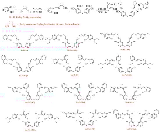 The general method for preparing Schiff bases is straightforward and involves the condensation reaction of primary amines and aldehyde precursor, typically in an alcoholic solution or toluene under reflux conditions. Although the reaction is acid-catalyzed, catalysts are generally unnecessary when using aliphatic amines. To achieve high yields, water produced during the reversible reaction can be removed using a water knockout drum. For purification purposes, it is preferable to recrystallize Schiff bases (e.g., CH2Cl2/Et2O or CH2Cl2/hexane) rather than employing chromatography to avoid degradation through hydrolysis. Unlike many free Schiff bases that may not remain stable in solution and require template synthesis in the presence of a metal ion, most binuclear Schiff base ligands investigated in this study exhibit stability both in solution and in their solid state under ambient air conditions for synthesis, characterization, and application purposes. Therefore, binuclear Schiff base ligands containing two tetradentate [O^N^N^O] chelating units might be more suitable for sensing applications via coordination reactions. Thus, binuclear Schiff base ligands, including two tetradentate [O^N^N^O] chelating units, might be more suitable for sensing applications via coordination reaction. All the binuclear Schiff base ligands (Scheme 1) were prepared according to our previous report [50,51,52,53,54] and the reported literature [55,56].