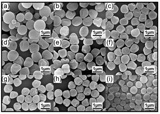 Figure 1 shows SEM images of poly(styrene-co-(2-(4-Vinylphenyl)ethene-1,1,2-triyl)tribenzene) (PS@TPEE) fluorescent microspheres prepared by two-step dispersion polymerization using DMC stabilizer concentrations ranging from 0.025 to 3 wt% (Table S1, entries 1–9). When the concentration of DMC was 0.025 wt%, the resulting fluorescent PS@TPEE microspheres showed obvious polydispersity, as shown in Figure 1a. This was due to the amount of stabilizer being too small, and not enough to stabilize the nucleus after nucleation, resulting in nuclear aggregation and the formation of large particles. As the amount of DMC stabilizer increased from 0.05 wt% to 2 wt%, monodispersive apple-shaped PS@TPEE fluorescent microspheres were successfully synthesized, as shown in Figure 1b–h. When DMC concentration increased to 3 wt%, PS@TPEE fluorescent microspheres obtained were polydispersed as spherical with coagulation and secondary particles, as reported by Zhang et al. [58].