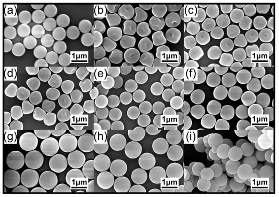 SEM images of PS@TPEE fluorescent microspheres prepared with different amounts of DMC (relative to St): (a) 0.025 wt%, (b) 0.05 wt%, (c) 0.1 wt%, (d) 0.3 wt%, (e) 0.5 wt%, (f) 1 wt%, (g) 1.5 wt%, (h) 2 wt%, (i) 3 wt%. Other reaction parameters: St (2.00 g), AIBN (0.04 g), TPEE (0.02 g), DVB (0.02 g), reaction medium ethanol–water (14.4 g/3.6 g, 80:20, w/w).