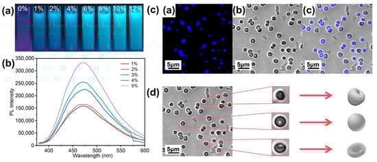 To explore the relationship between the fluorescence intensity of PS@TPEE microspheres and the content of fluorescent monomer TPEE, PS@TPEE fluorescent microsphere aqueous solutions with different TPEE contents were prepared. It can be seen that the fluorescence intensity increased gradually, as did the concentration of TPEE, with the irradiation of 365 nm UV light (Figure 4a). Figure 4b shows the fluorescence intensity curve of the PS@TPEE fluorescent microspheres in the solid state. The photoluminescence spectroscopy (PL) intensity increased with the concentration of TPEE. This was consistent with typical aggregation-induced effects and solved the problem that traditional fluorescent dyes cannot be used at high concentrations or in solid states due to the aggregative fluorescence quenching effect [62]. Therefore, PS@TPEE fluorescent microspheres with different luminescence intensities can be obtained by simply controlling the amount of TPEE.