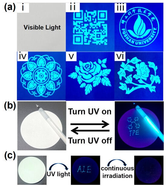 (a) Photo of screen-printed patterns under daylight (i) and ultraviolet (ii–vi) (PS@TPEE fluorescent microspheres are uniformly dispersed in 4 mass% polyvinyl alcohol in water). (b) Photograph of writing on cellulose paper with PS@TPEE fluorescent microspheres as water-based ink. (c) Photograph of letters written in fluorescent ink under ultraviolet light and the process of erasing.
