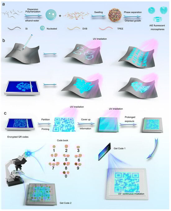 Due to their excellent luminescent properties, PS@TPEE fluorescent microspheres can be prepared as fluorescent inks. In order to verify the application effect of the fluorescent ink, different patterns including QR codes, school logos, and flowers were printed on the paper. These patterns are invisible under visible light, but display bright blue fluorescence under ultraviolet light, as shown in Figure 4a and Movies S1 and S2. The PS@TPEE fluorescent microspheres’ (TPEE content 5%) aqueous dispersion (solid content 10 wt%) can also serve as a filler for water-based anti-counterfeiting inks to write encrypted information on paper. The written content displays clear and bright blue fluorescence under ultraviolet light, and is not visible under sunlight (Figure 5b and Movie S3). Interestingly, the prepared fluorescent ink also exhibits erasability. After prolonged exposure to ultraviolet light, TPEE derivatives undergo cyclization under ultraviolet light to form diphenylphenanthrene (DPP) derivatives with ACQ activity [63,64], causing the written letters to gradually disappear and the encrypted information to be deleted (Figure 5c). This irreversible erasure prevents encrypted information from being read multiple times, ensuring information security.