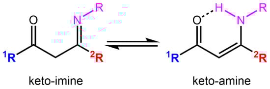 Schiff bases, characterized by an imine (>C=N-) group [1,2], form an outstanding class of compounds that play a key role in organic chemistry and in the development of coordination chemistry due to their facile synthesis, structural flexibility, easily tunable electronic properties, versatility, and their ability to form stable complexes under various coordination geometries and oxidation states [3,4,5,6]. ONX-tridentate Schiff base proligands (X = O, N, S), resulting from the monocondensation of 1,3-diketones with primary amines [7,8,9], can exist in solution as a tautomeric mixture of ketoamine (enaminone, -(O=)C(1R)-CH=C(2R)-NH-) and ketoimine (iminone, -(O=)C(1R)-CH2-C(2R)=N-) forms (see Chart 1) [10].