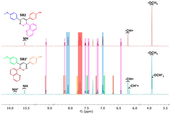 The solid-state FT-IR spectra (KBr pellets) of the isolated regioisomers SB1–SB3 (Figures S4–S6 and Table S1) exhibit the characteristic absorption bands of Schiff base compounds derived from 1,3-diketones reported in the literature [31]. The spectra show vibrational bands of strong and medium intensity between 1603 and 1545 cm−1, mainly associated with the stretching vibrations of C=O, C=N, and/or C=C. In addition, the spectrum of SB2 displays a low-intensity band attributed to the stretching vibrations of C≡N at 2223 cm−1, while that of SB3 shows a strong intensity absorption band associated to stretching vibration of C-F at 1322 cm−1 [32].