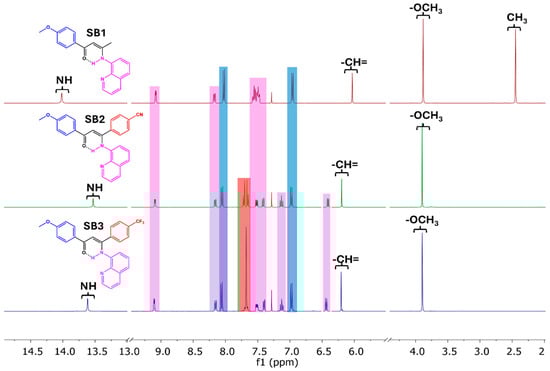 Comparative 1H NMR spectra of Schiff base compounds SB1–SB3. All spectra were acquired in CDCl3 at 400 MHz and 20 °C. The associated resonances are given in the color of the respective fragments in each case.