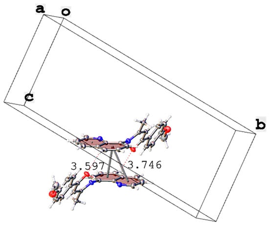 The stability of the crystal structure of compounds SB1–SB3 was attributed to intermolecular hydrogen bond interactions and π interactions between the quinolinic fragments. The hydrogen bond distances and symmetry coordinates for intermolecular interactions are detailed in Table 2. For SB1, an antiparallel displaced π–π intermolecular interaction between aromatic ring planes in quinoline moieties was observed. Each aromatic ring in a quinolinic fragment represents a plane, (-C12-N13-C14-C15-C16-) and (-C11-C12-C16-C17-C18-C19-), with each plane interacting with another aromatic ring (-C11-C12-C16-C17-C18-C19-)i of an adjacent quinoline moiety, with centroid–centroid distances of 3.597 and 3.746 Å and shift distances of 1.248 and 1.444 Å, respectively (Figure 4). In this conformation, the presence of weak intermolecular hydrogen interactions C17-H17···O2i of 3.370 Å (donor–acceptor distance), and C19-H19···O2ii of 3.480 Å, was observed.